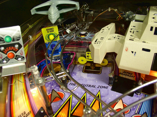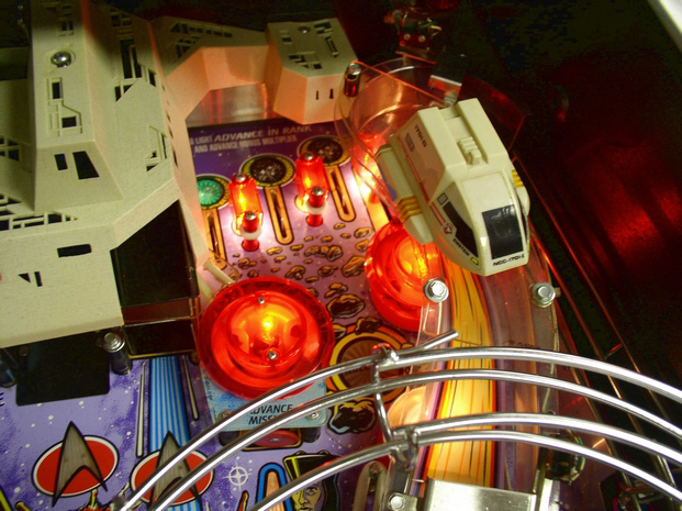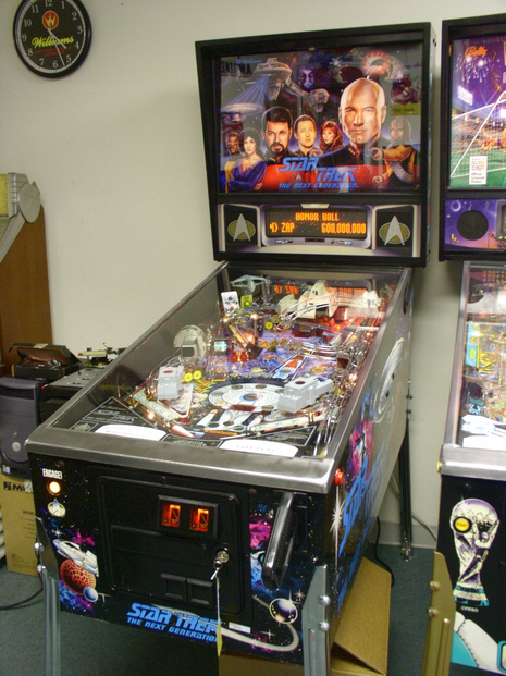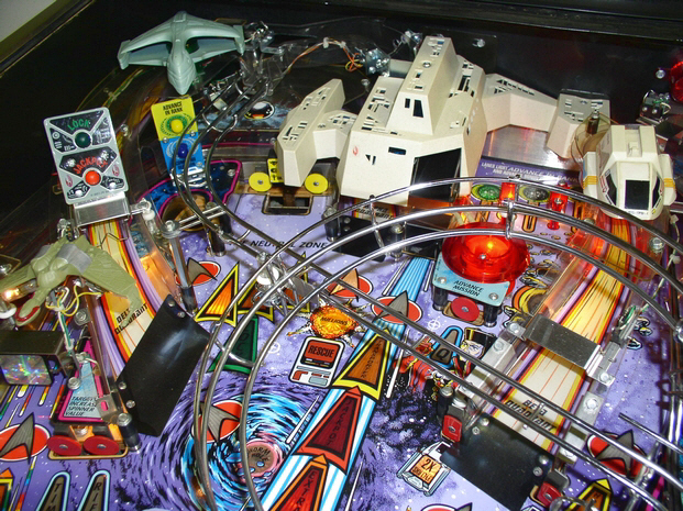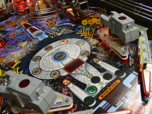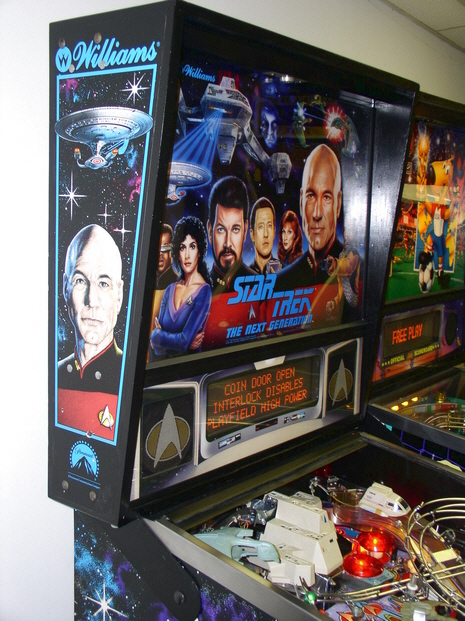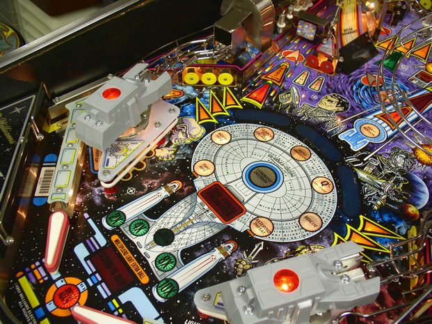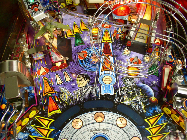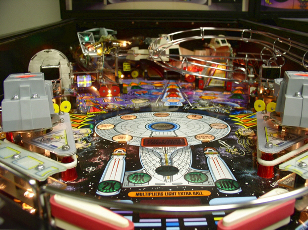 Star Trek the Next Generation (ST:TNG) encompasses what a great pinball experience should be. The colorful artwork surrounding the cabinet is easy on the eyes and complements the games atmosphere. The playfield artwork is equally rich in detail with all of Star Treks nemeses present including the Ferengi, Romulans, Cardasians and even the relentless Borg. ST:TNG is one of the few "Super-Pins" that is approximately 4 inches wider than a standard pin. This extra playfield space gave the designer Steve Ritchie freedom to do the television and movie franchise justice.
